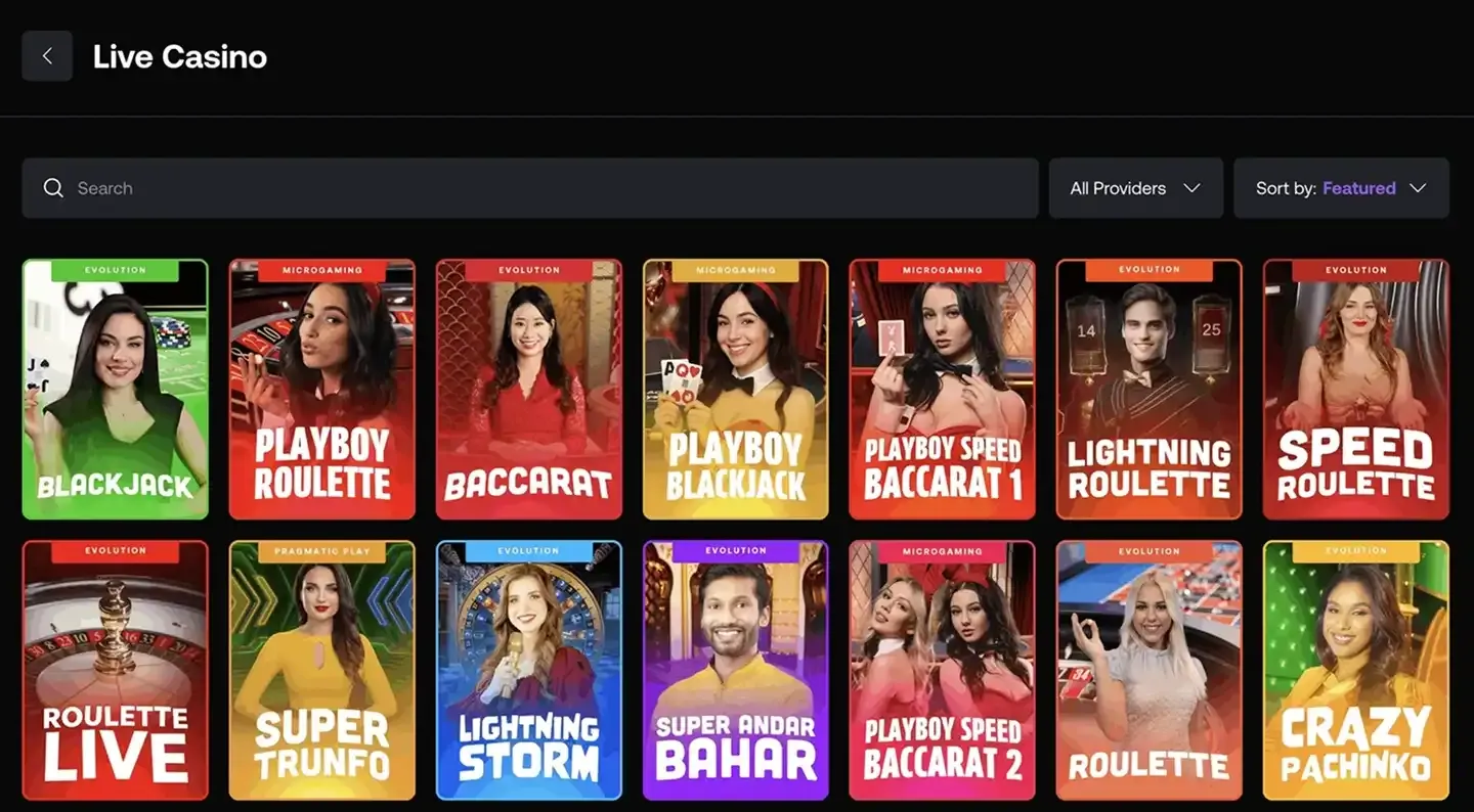 | Live Dealer | Live Blackjack, Live Baccarat, Crazy Time | Evolution Gaming, Pragmatic Play Live | 96% - 99% |